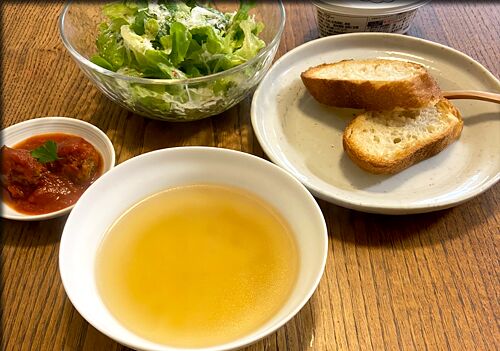 今日は一日雨の土曜日。 その1:コンソメスープ 朝ゆっくりだったのでお昼は軽くていいと相方・・・ それなら、冷凍してあるバケット、残っているレタスとパルミジャーノ、それに今朝のmiyakoさんのコンソメスープ。 顆粒コンソメのスープが美味しくなる裏…