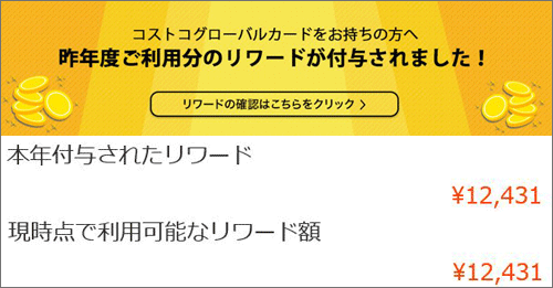 コストコでグローバルカードが始まって丁度一年、真っ先に申し込みましたから、「リワードが付与されました」とお知らせが来ました。