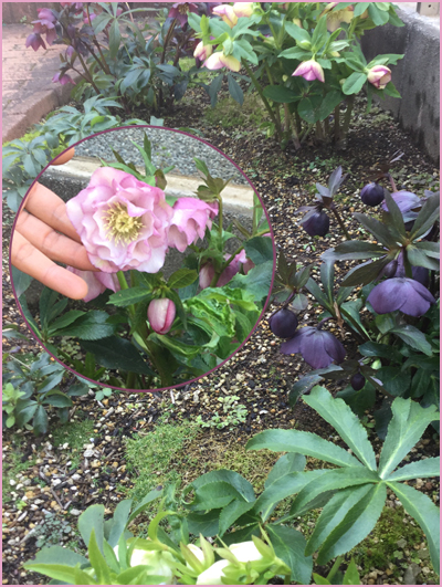 皆さんのブログにもたくさん登場しているクリスマスローズが玄関の通路両脇に10種類くらい満開でした。