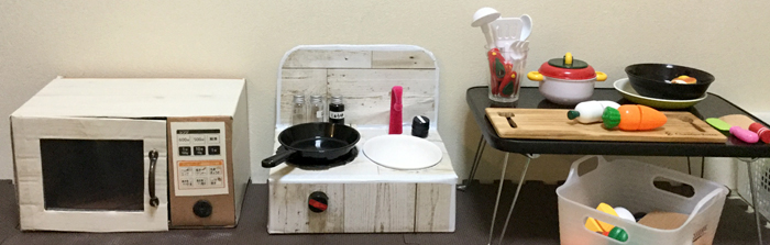 実際はレンジの下にも台を置きましたが、「ピッ!ピッ!ピッ!」と言いながら、レンジのボタンを押して料理をいっぱい作ってくれました。流しよりレンジが特に気にったようです。