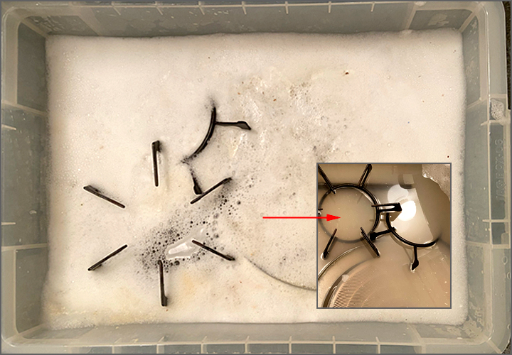 久しぶりに「オキシクリーン」の浸け置き。魚焼きグリルを全部引き抜き、五徳、換気扇など全部まとめてオキシクリーン。この為だけに置いてある収納ボックス。