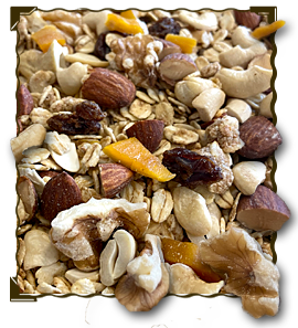 オートミール、全粒粉、ナッツ(アーモンド・カシューナッツ・クルミ)、レーズン、ドライマンゴー、バター、塩、メープルシロップで作る、全部オーガニック。