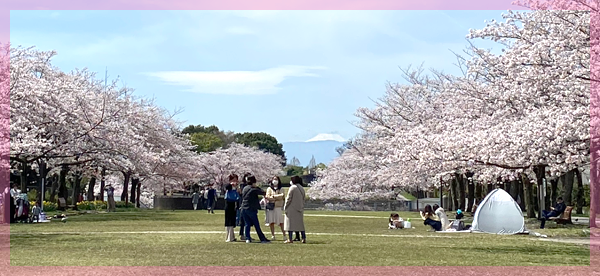 富士山バッチリ、桜はまだまだ満開見ごろ、芝生の上は花絨毯、温かくて最高でした。