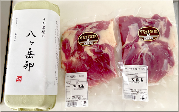 今回は一番人気の八ヶ岳卵(1080円)と軍鶏(しゃも)の冷凍と生を。