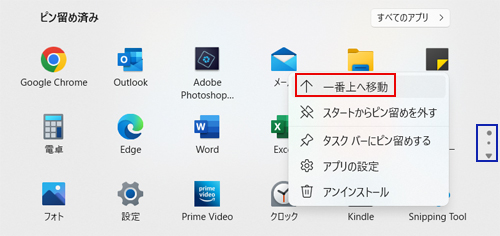 スタートの位置とアイコンが変わりましたが、そのスタートをクリックした「ピン留め済み」の画面によく使うアイコンを置いて並べ順を使いやすくする作業がパズルのようで楽しかったです。(ドラッグでは移動できないので、右クリック>一番上へ移動の繰り返し)