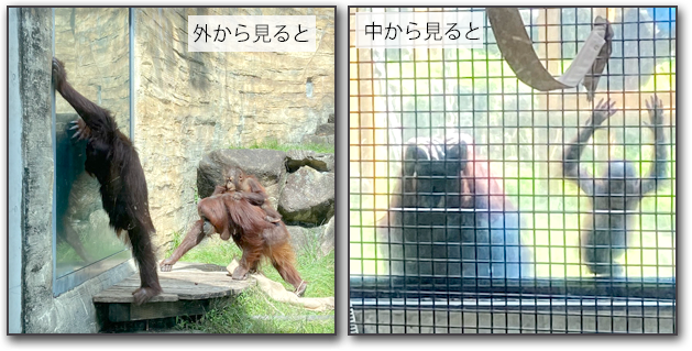 ガラスの窓の中が気になって覗くのですが、外が明るいのでよく見えない、そこで手で目の周りを囲っておりました。(笑)それを中側から見る面白さ。(^^)