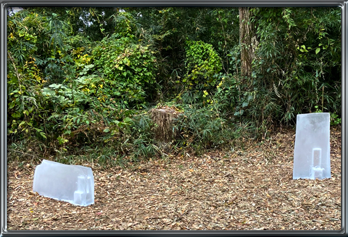 林を背に2つのガラス作品、透けて見えるものの中に何かかくれんぼしているのか、楽しい作品でした。