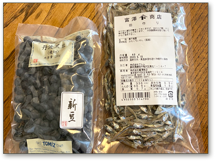 黒豆は丹波産(岡山産の丹波黒豆もあるのです)の新豆と決めていますが、今年は小袋に、田作りも一番小さい袋にしました。