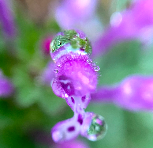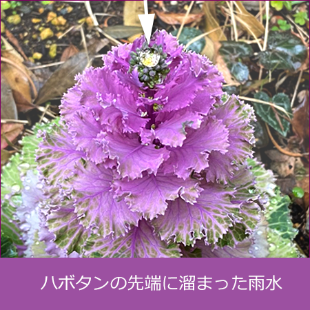 帰り道はまだ小雨でしたが、歩いて10分ほどの歩道には「雨粒」がいっぱい…傘さしながら荷物持ちながら、撮った内の一つがこのハボタンでした。雨粒は楽しい!(^^)