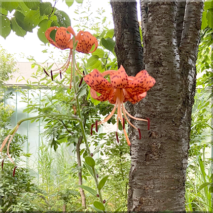 夕方、市の6つの花壇に2人で水遣りをした後、ふと見ると・・・マンションの中庭のオニユリの葉の付け根に何かいっぱい付いています・・・もしかして「ムカゴ?」