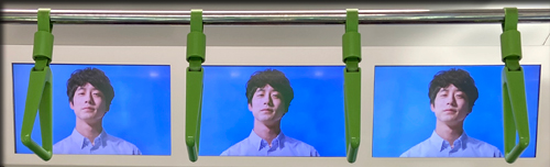 車両全部坂口健太郎さん一色、15分間エンドレスでこのCMが目に入り続けると、この化粧品を使って「透明感のある肌」になりたくなりました。(笑)