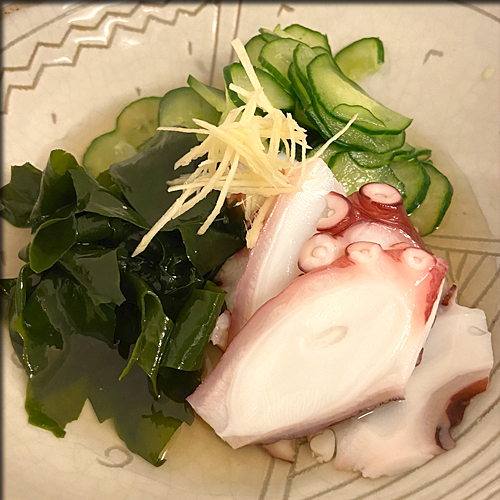 魚屋さんの生わかめと蛸の酢物、白茄子のソテー。