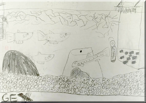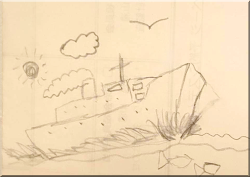 先日娘宅に行った時、Kが裏紙にささっと描いてくれた船の絵や彼の水槽のスケッチ。