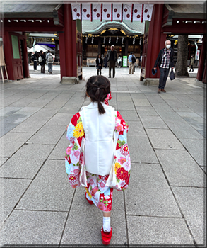 去年のAちゃんの7歳の七五三のお姉さんらしいのとも違って3歳はただ可愛い。草履も履きこなしてさっさか歩きましたが、3歳の七五三用の着物の丈がツンツルテンなのです、背が高いとは思っていましたが、神社の身長計で見るともう110cm。^^;